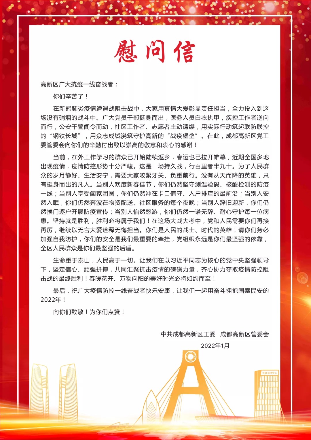 致成都高新區(qū)廣大抗疫一線奮戰(zhàn)者的一封信