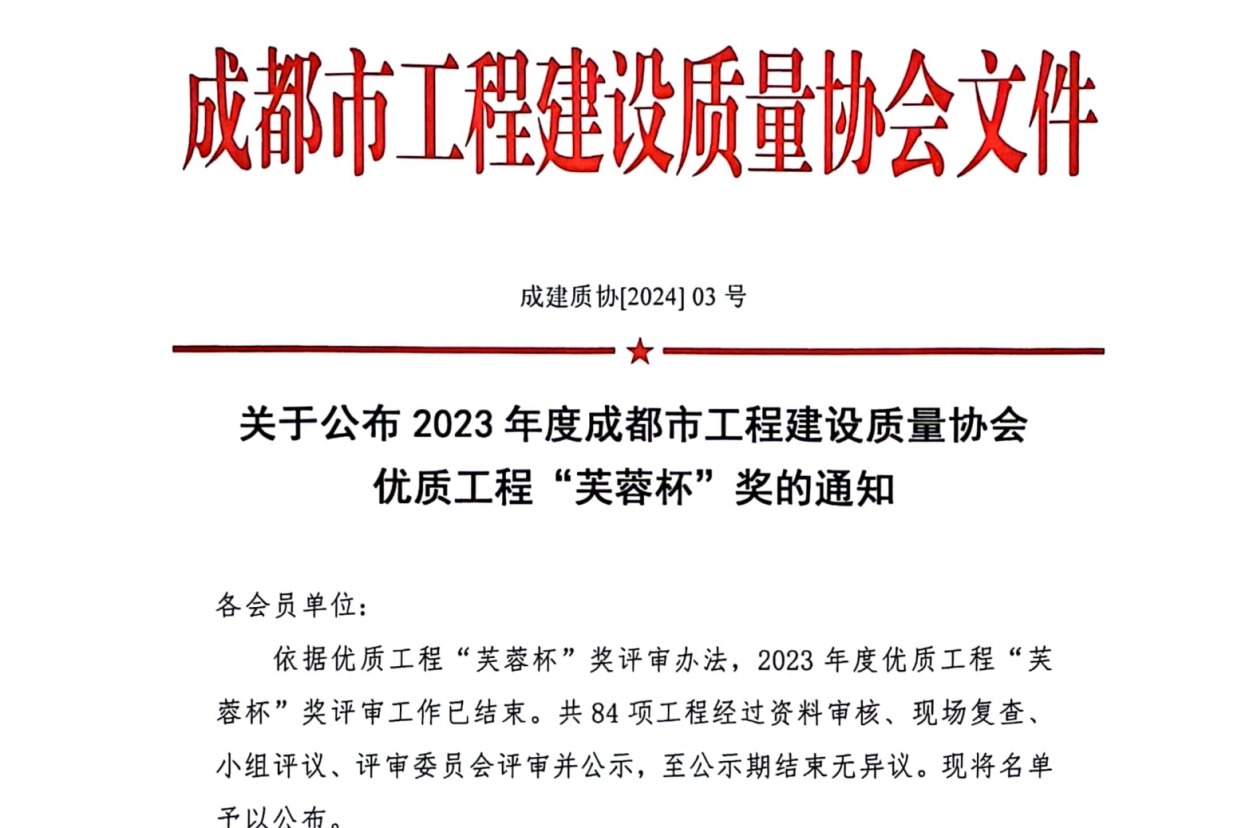 倍特建安2個(gè)項(xiàng)目獲成都市優(yōu)質(zhì)工程“芙蓉杯”獎(jiǎng)