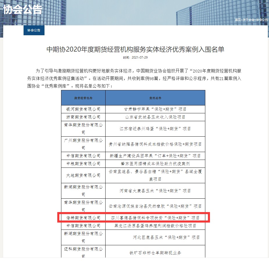 喜報(bào)!倍特期貨四川喜德縣豬飼料專項(xiàng)扶貧 “保險(xiǎn)+期貨”項(xiàng)目入選中國(guó)期貨業(yè)協(xié)會(huì)優(yōu)秀案例
